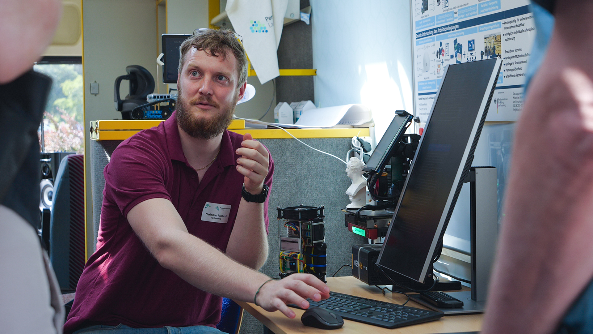 An 19 Info-Ständen und im PAL-Bus des Fachkräftenetzwerks Oberlausitz erhielten die Gäste anhand verschiedener Demonstratoren Einblicke in verschiedene PAL-Projekte und Forschungsergebnisse, darunter KI-Assistenzsysteme, Datenbrillen, Wearables, flexible Robotik-Lösungen, Chatbots und Gamification-Ansätze: