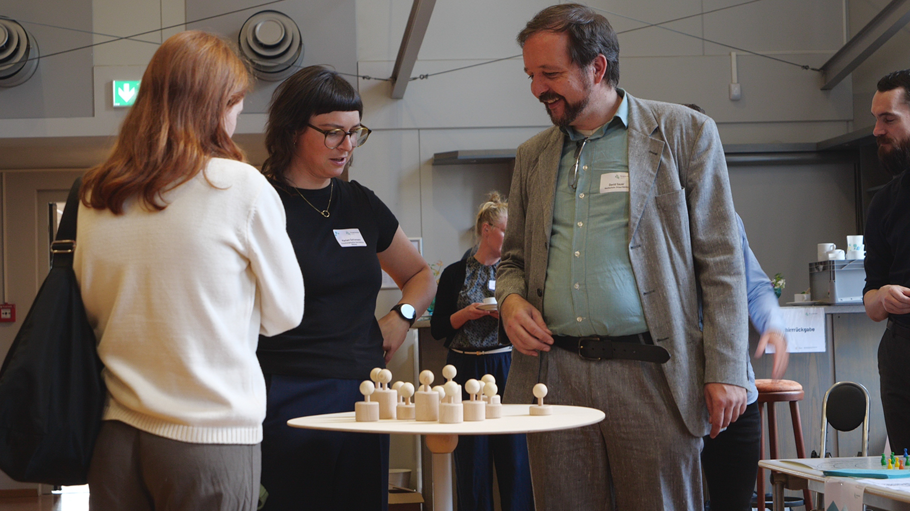 Zum Abschluss des Panels waren die Gäste eingeladen, selbst aktiv zu werden: Anhand eines individuell ausgewählten LEGO-Teils erzählten sie ihren Sitznachbarn von eigenen Erfahrungen mit Digitalisierungsprojekten – ob gelungen durch frühe Beteiligung oder problematisch durch fehlende Partizipation. Diese persönliche Ebene förderte den Austausch und bereitete den Weg für die nachfolgenden vertiefenden Gespräche an den Ständen.