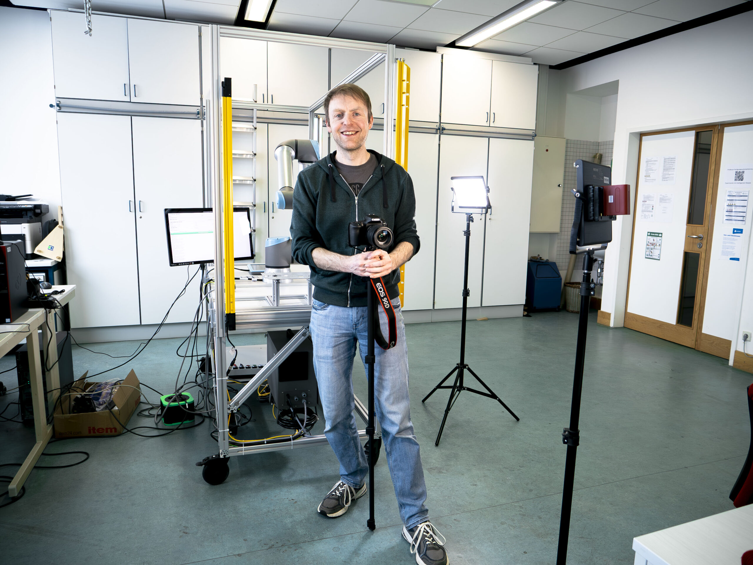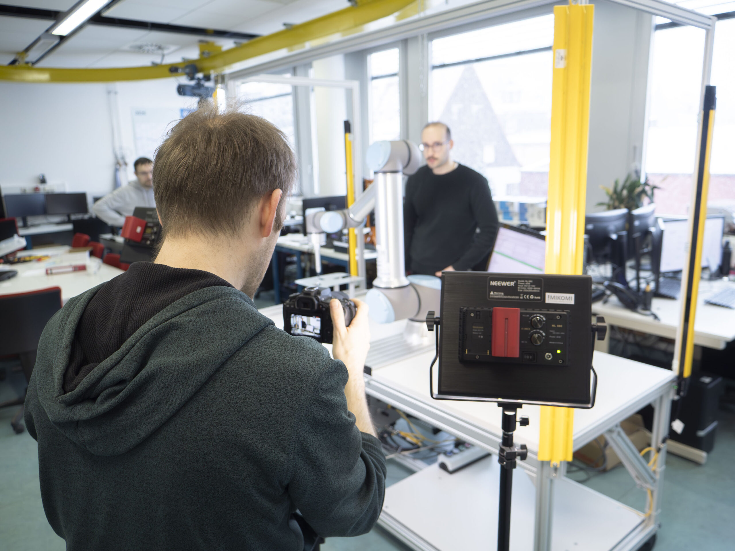 Für die eigentlichen Dreharbeiten wird der Cobot in Szene gesetzt. Ein Aspekt ist das Einleuchten der Umgebung, um sowohl die Maschine als auch deren Details klar sichtbar zu machen. Gleichzeitig wird darauf geachtet, ruhige und aufgeräumte Hintergründe zu schaffen, damit der Fokus vollständig auf dem System liegt.